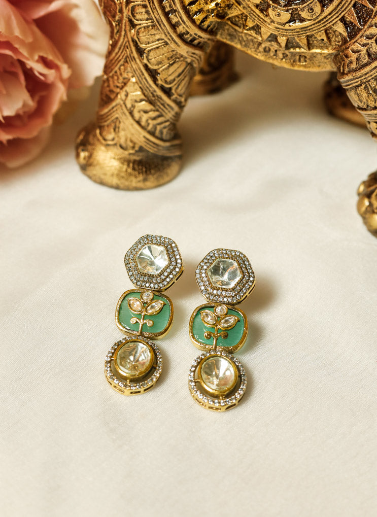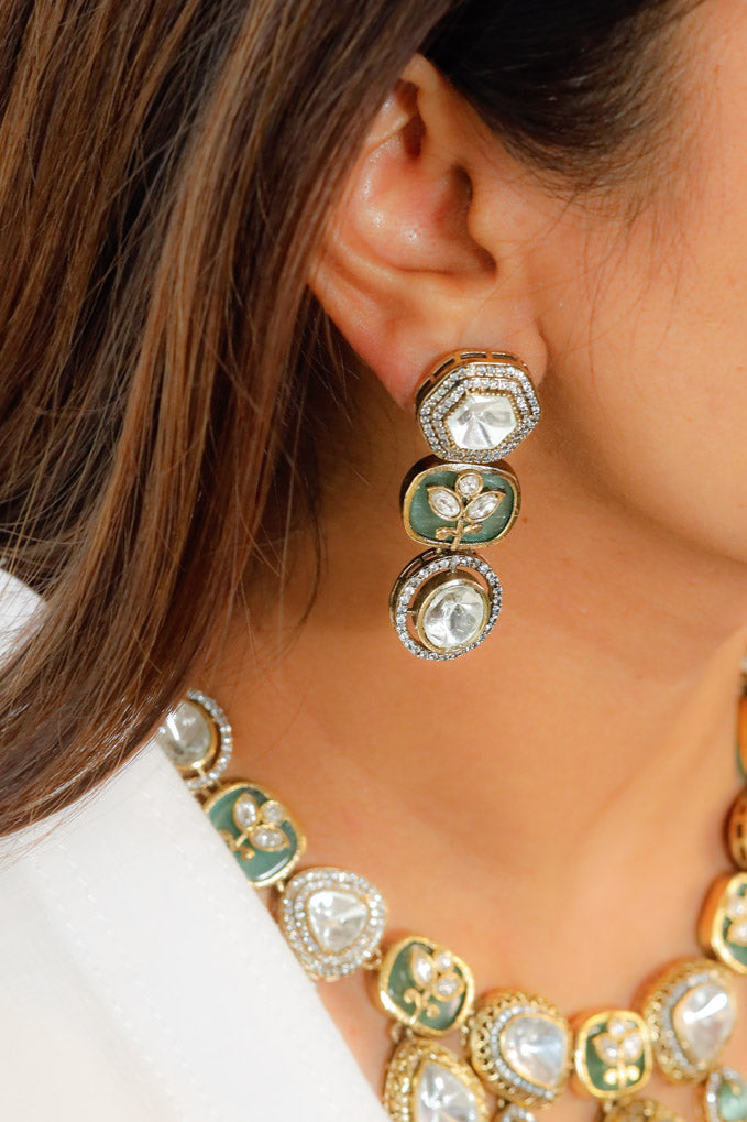 Iraahi features a stunning arrangement of hand-set kundan stones paired with delicate mint-green enamel motifs that bloom like royal garden vines. The necklace is further adorned with dainty circular cabochons and intricately carved gold-finished floral patterns, bringing richness and depth to its design.