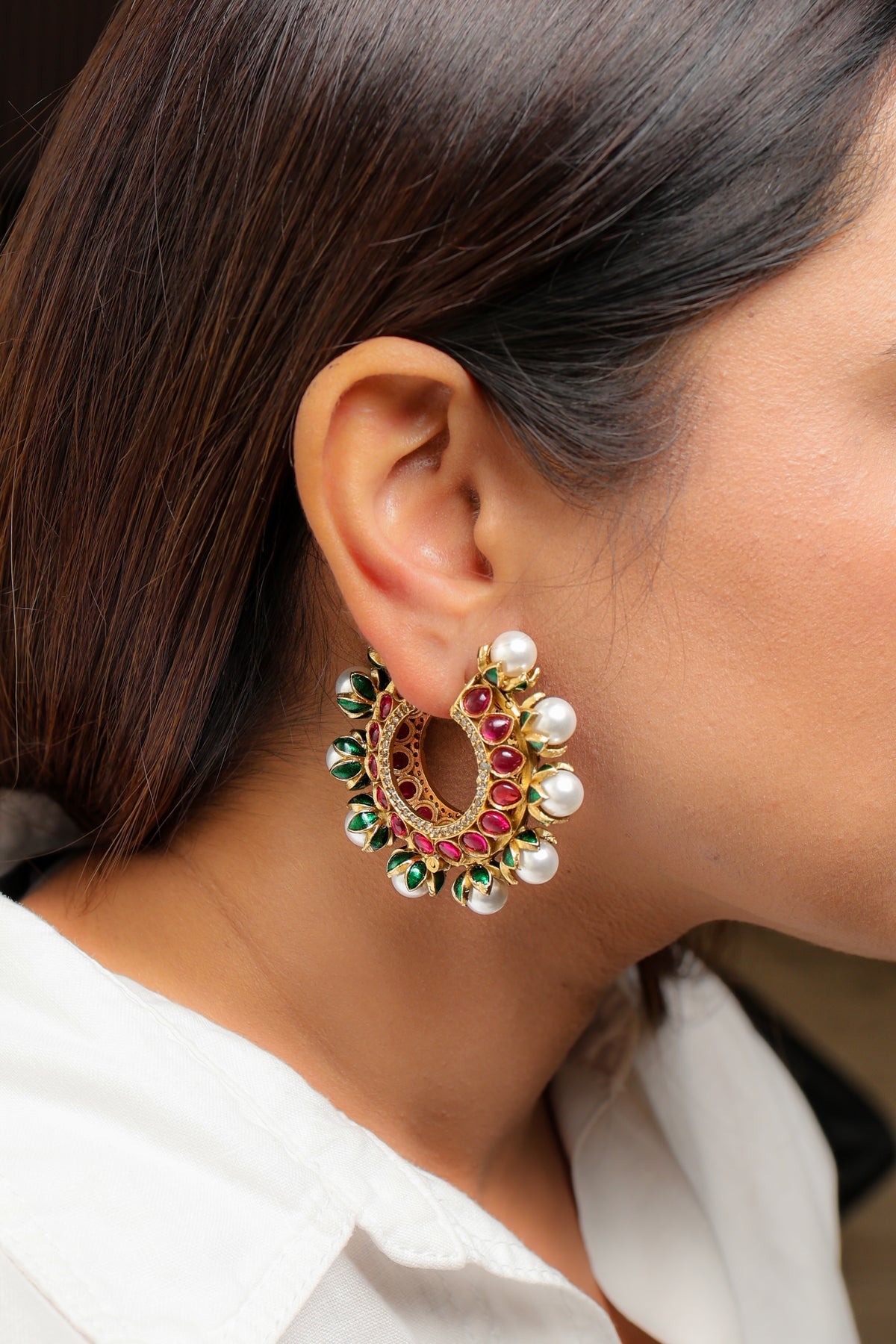 Regal, vibrant, and timeless — the Rajwada Hoops echo the grandeur of Jaipur’s royal courts. With their crescent silhouette adorned in ruby-red and emerald-green stones, framed by lustrous pearls, these hoops embody the essence of heritage jewellery reimagined for the modern queen. A perfect balance of tradition and elegance, they bring festive radiance to every occasion.