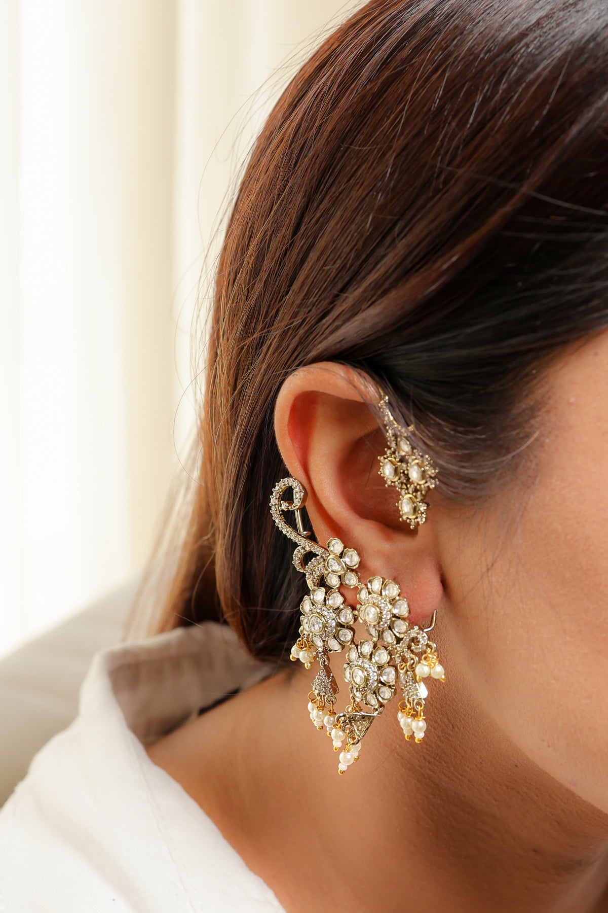 Handcrafted with finesse, the Roohani Cuffs feature a cascade of floral motifs studded with kundan and shimmering crystals, accented by delicate pearl drops. The elongated, curve-hugging design makes them an elegant alternative to classic earrings — bold, yet graceful. Finished in antique gold polish, these cuffs capture the artistry of Jaipur’s finest craftsmanship while adding a hint of modern sophistication.