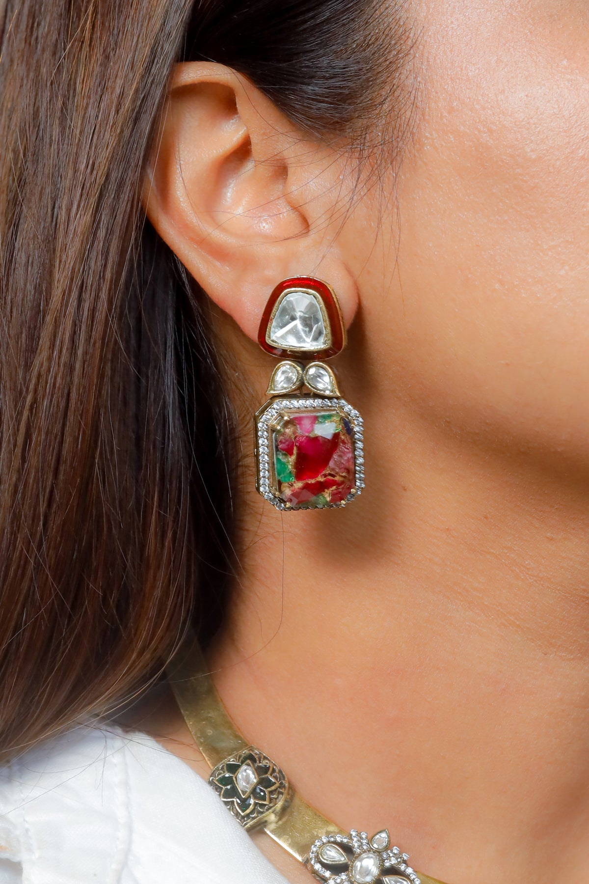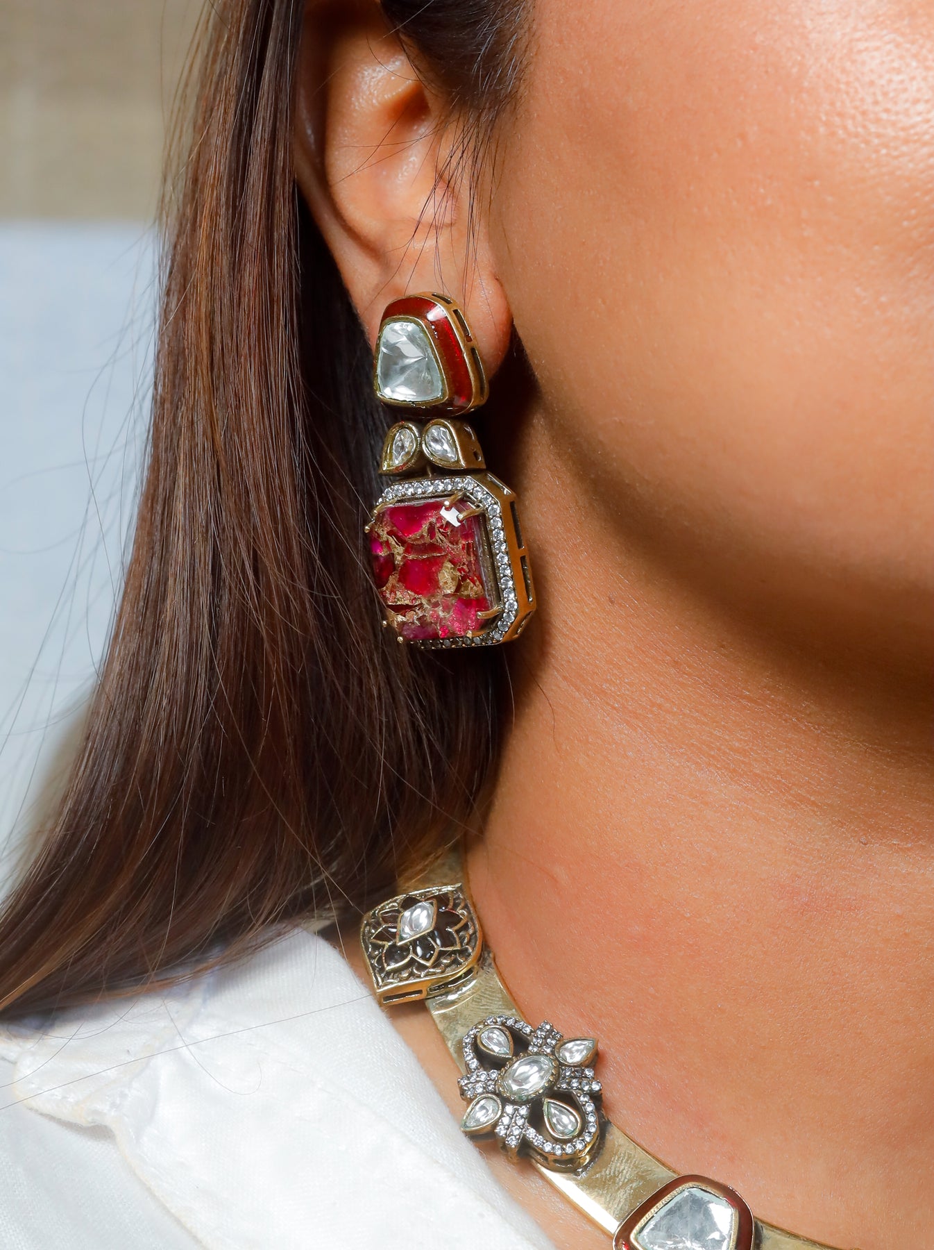 Introducing the Saanjh Hasli Set, a regal statement from our exclusive heritage collection. Inspired by the opulence of royal courts, this handcrafted masterpiece features intricately embedded multi-hued stones, delicate floral motifs, and heritage kundan accents. Set in a luxurious gold-plated brass base, the hasli curves elegantly around the neck, paired with matching earrings that exude vintage charm.