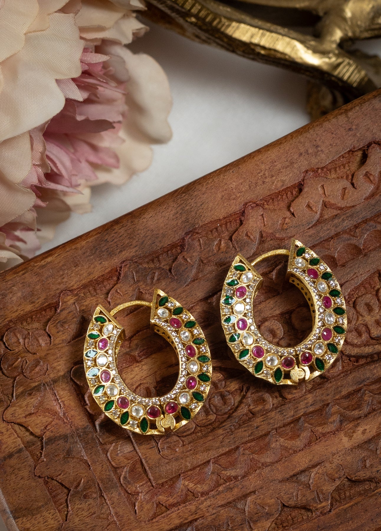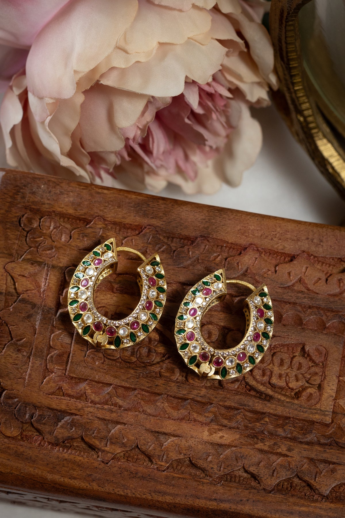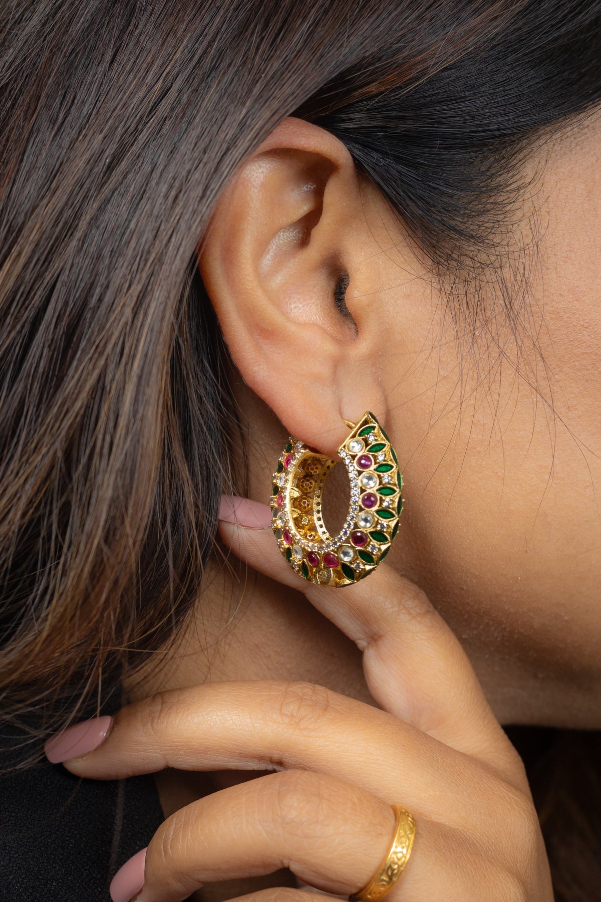 The Saanjh Hoops feature a crescent-inspired silhouette studded with a vibrant combination of red, green, and white stones. Each gem is intricately hand-set in a kundan-style setting with delicate enamel detailing, giving the earrings a royal, heirloom look. The bold structure is balanced with precision and symmetry, making them a standout addition to any ethnic ensemble.