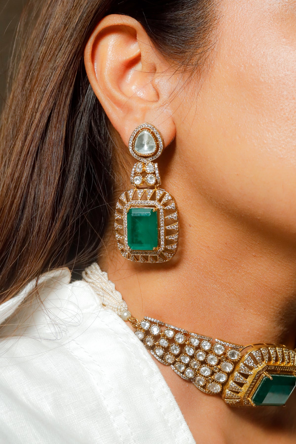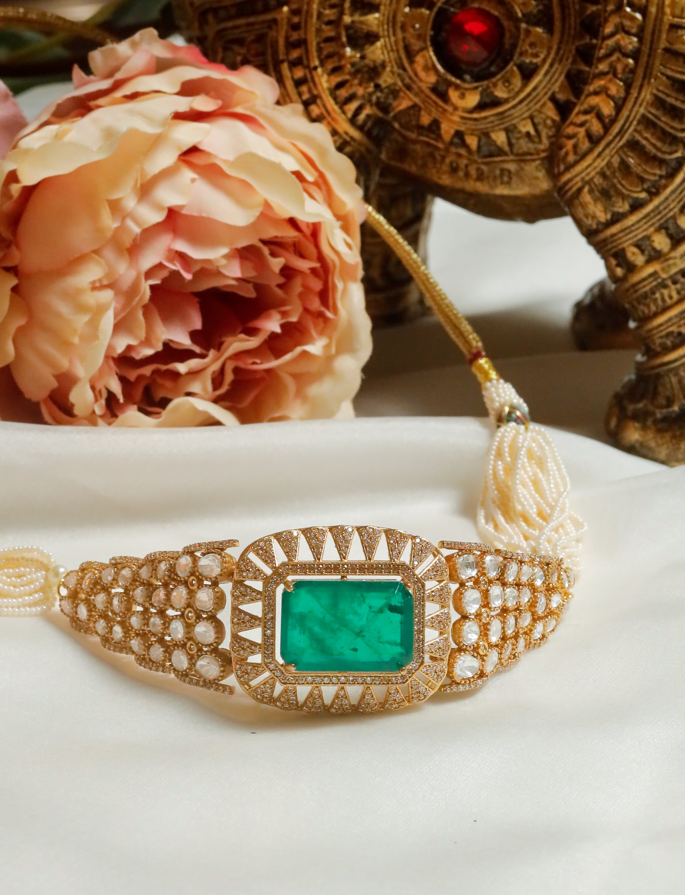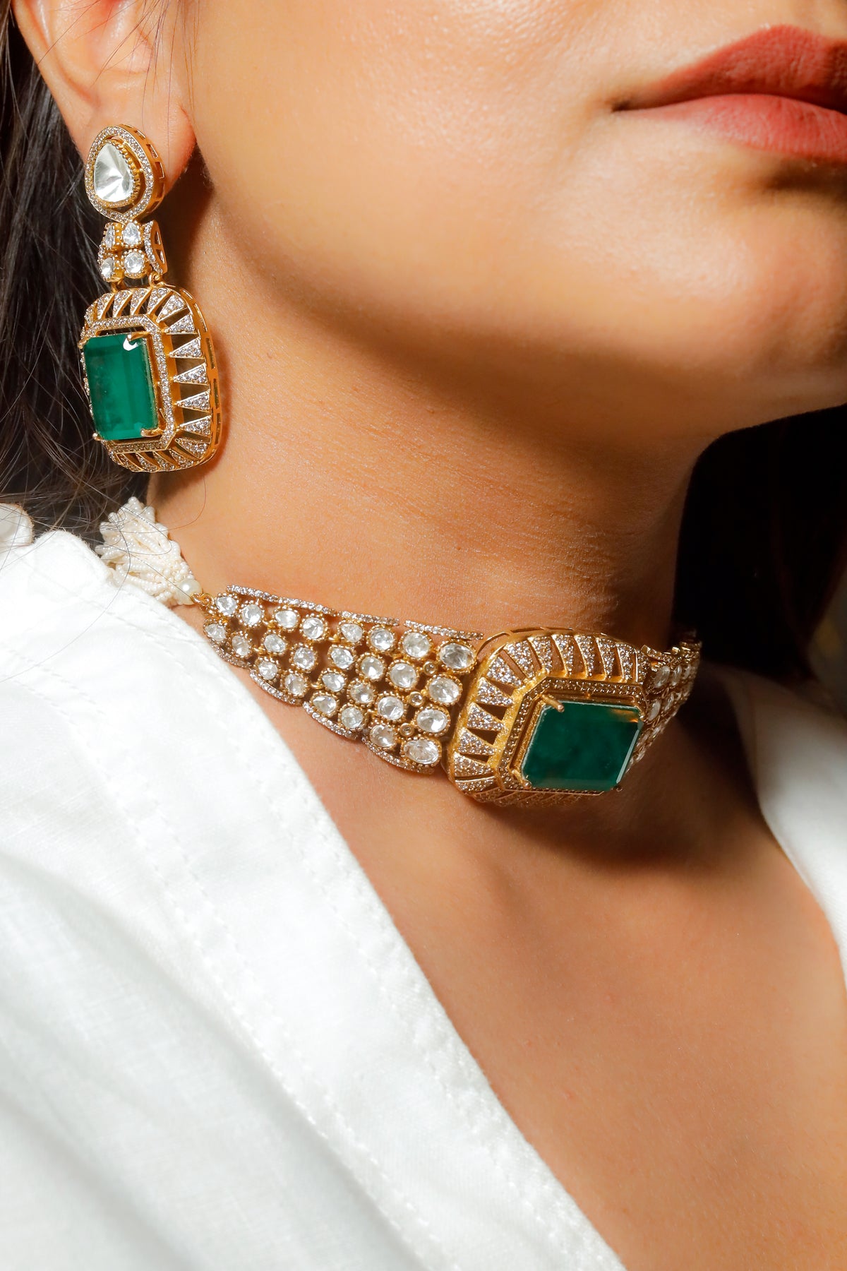 The "Sitara Choker Set" is an exquisite piece crafted for the modern woman who appreciates a fusion of regal tradition and contemporary sophistication. This choker is adorned with precision-cut moissanite stones, celebrated for their diamond-like brilliance and fire. The bold, emerald-green center stone is beautifully complemented by two cascading rows of shimmering moissanite, creating a luxurious mosaic of sparkle and elegance.
