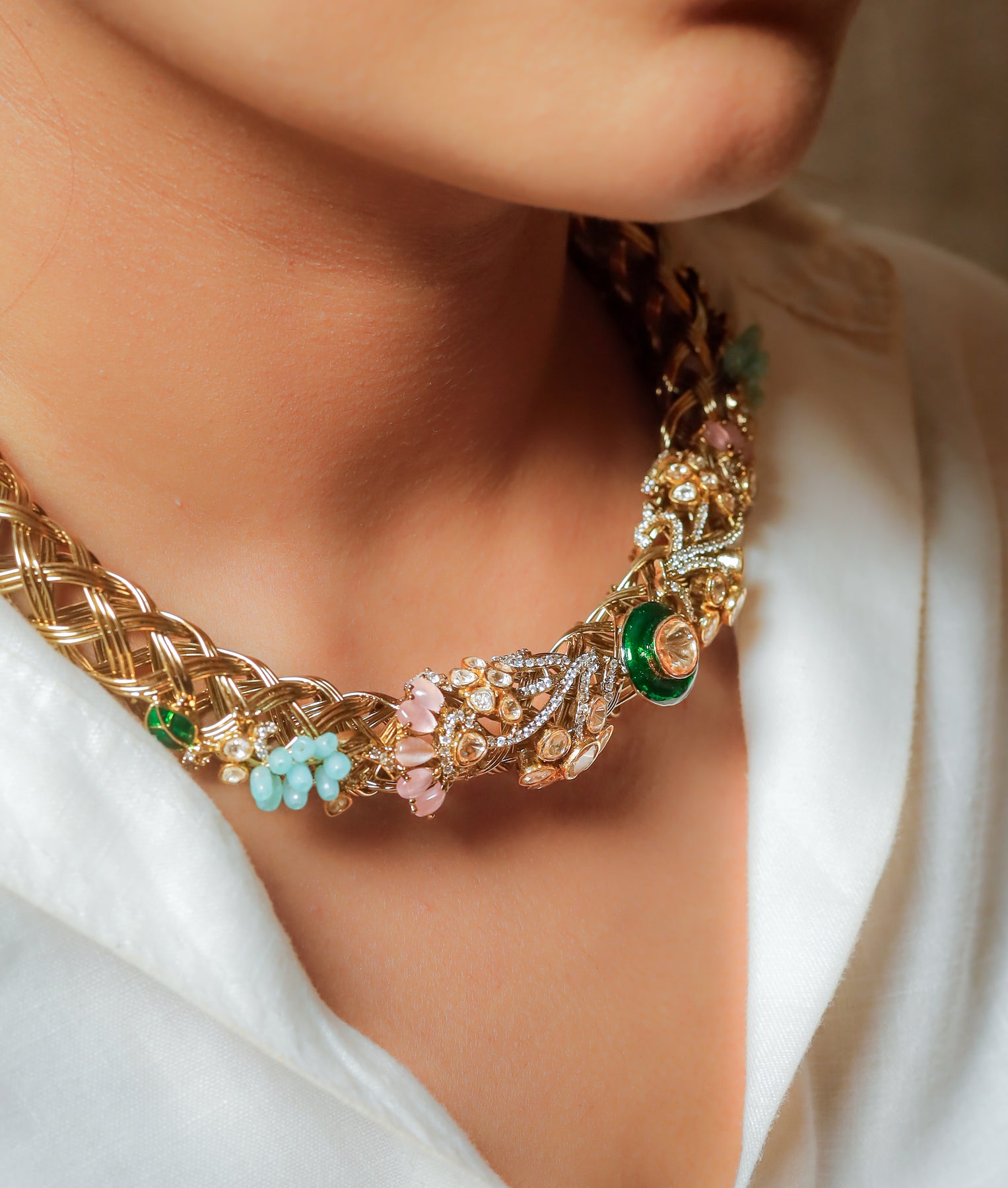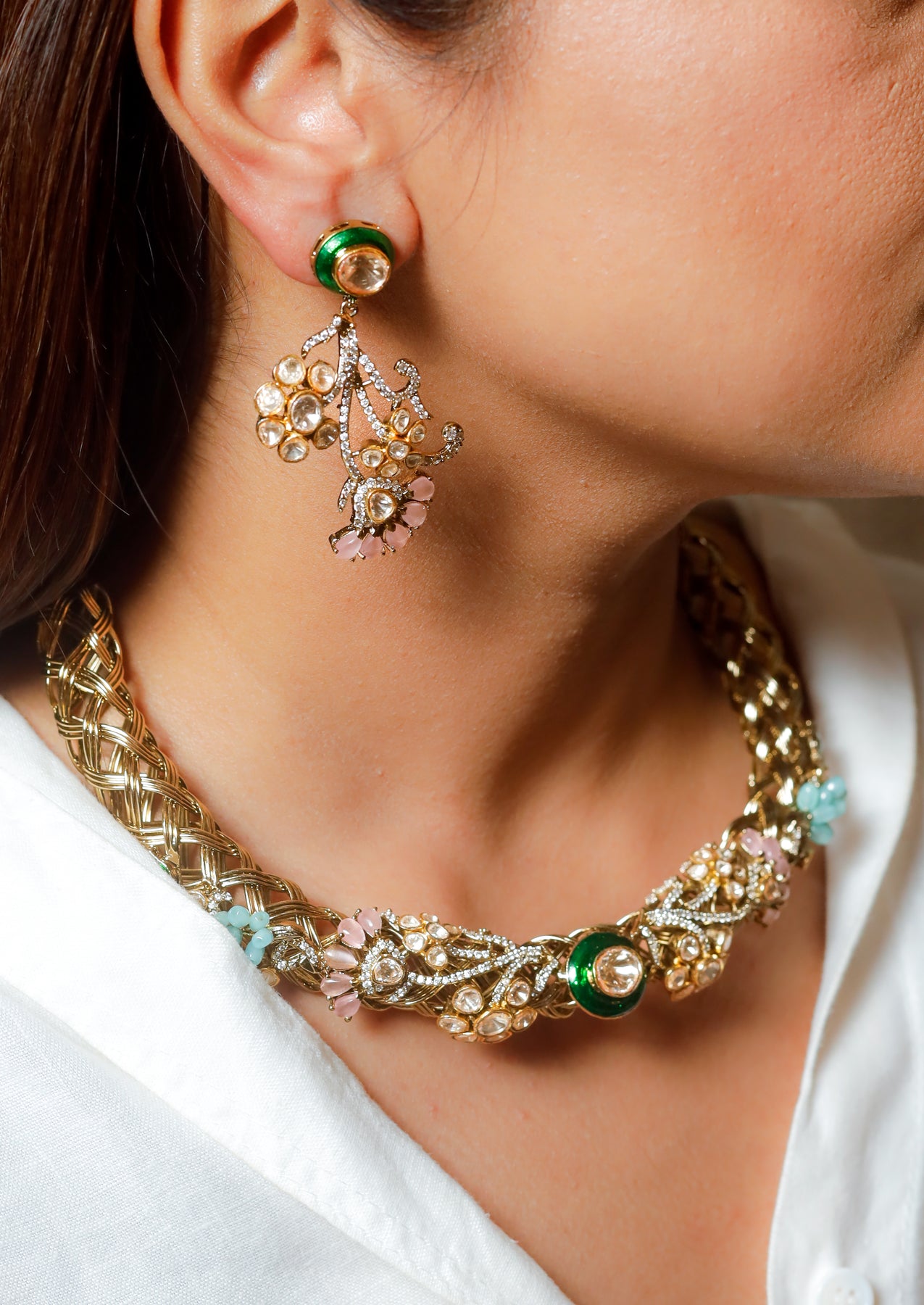 Introducing the Zahra Hasli Set — a masterful blend of heritage and modern sophistication. Handcrafted in brass with a rich gold polish, this exquisite set features a braided choker-style necklace, intricately woven to reflect regal craftsmanship. Embellished with kundan stones, delicate floral vines, and pastel-hued beads in pink and aqua, Zahra celebrates nature-inspired motifs with royal flair. The green enamel kundan centerpiece adds a striking focal point, reminiscent of vintage heirlooms.